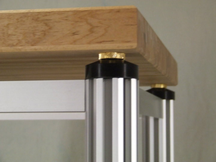 Commonly referred to as "end caps" on most racks, these precision machined units serve several functions on the Adona rack. Obviously they add a "finishing touch" to the top of the column, but more importunately they provide a means of coupling (or decoupling) and allow platforms or additional rack layers to be placed above the columns.