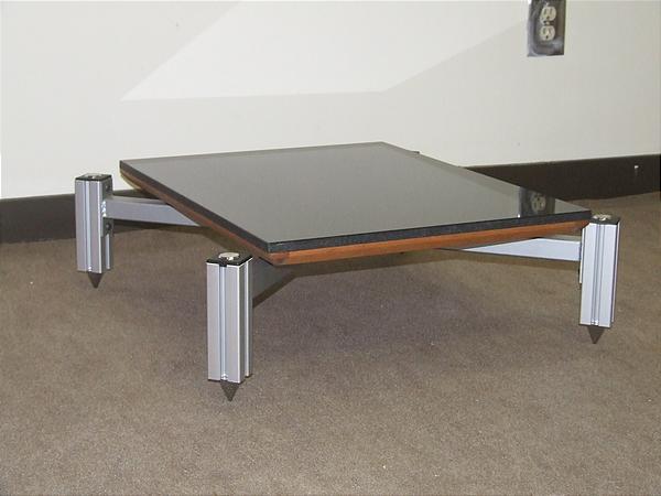 The shelf support-frame utilizes heavy-gauge steel tubing fully welded at the center point to increase torsional stiffness. The attachment plates are fabricated from 1/4 inch steel plate. Steel, like granite, rings like a bell unless it is properly damped, so the weight of the granite rests at points that interfere with the linear resonance of the tube. When filled with sand (or lead shot), the frame becomes about as sonic as "a stick in the mud" yet it continues to couple energy toward the floor. Leveling is provided by a 1/4-20 conical set screw and jam nut at each leg of the support frame.