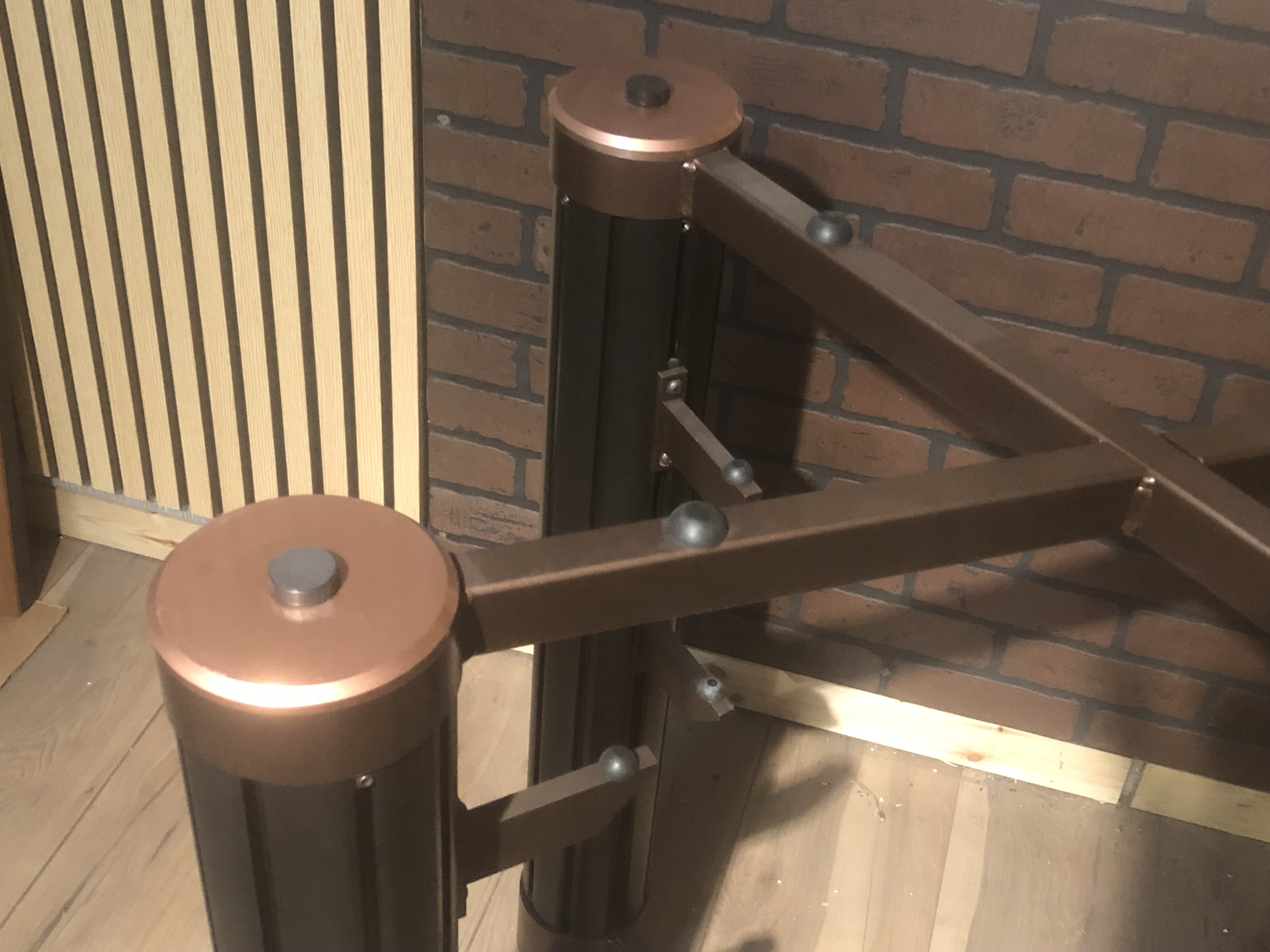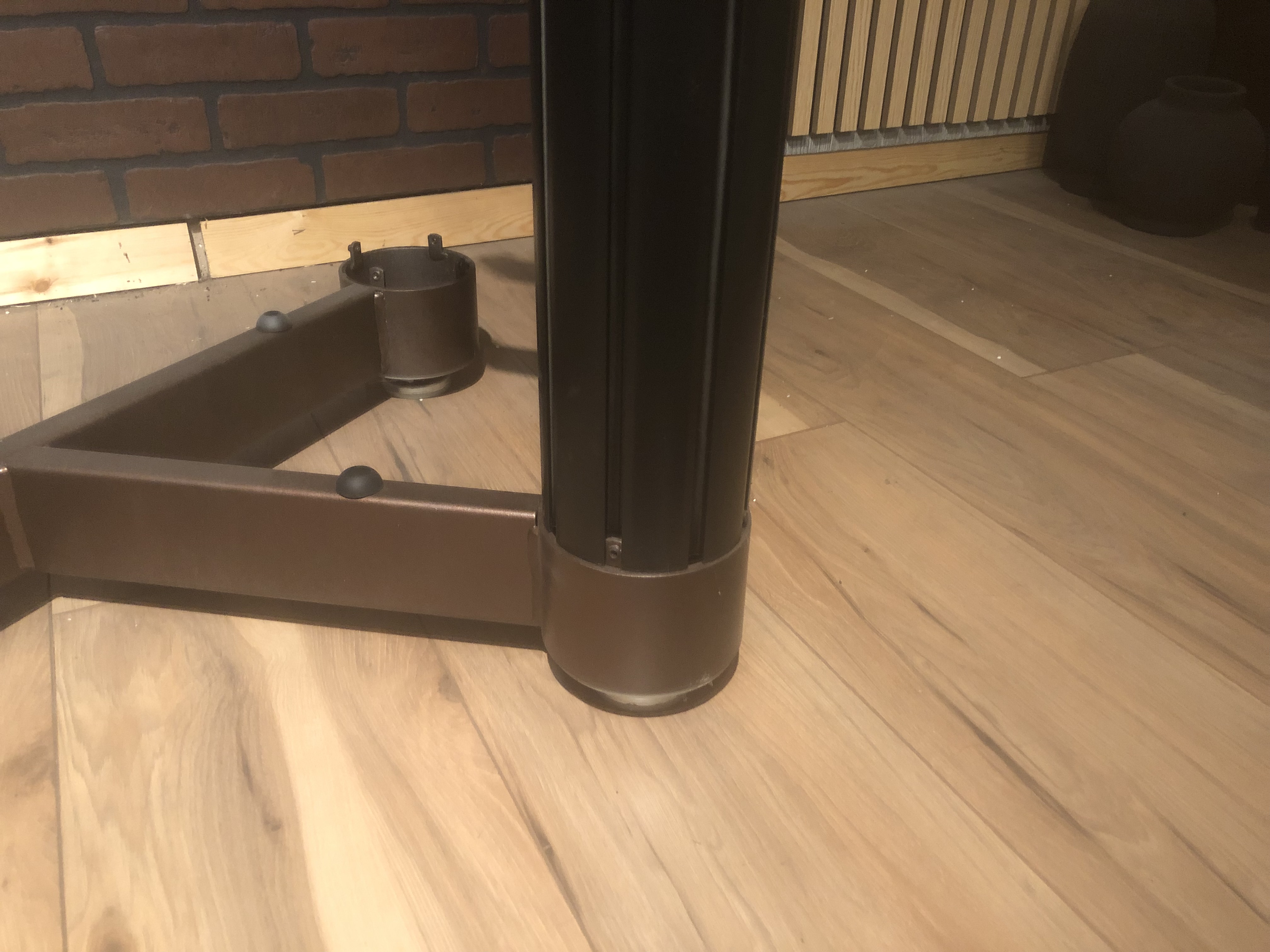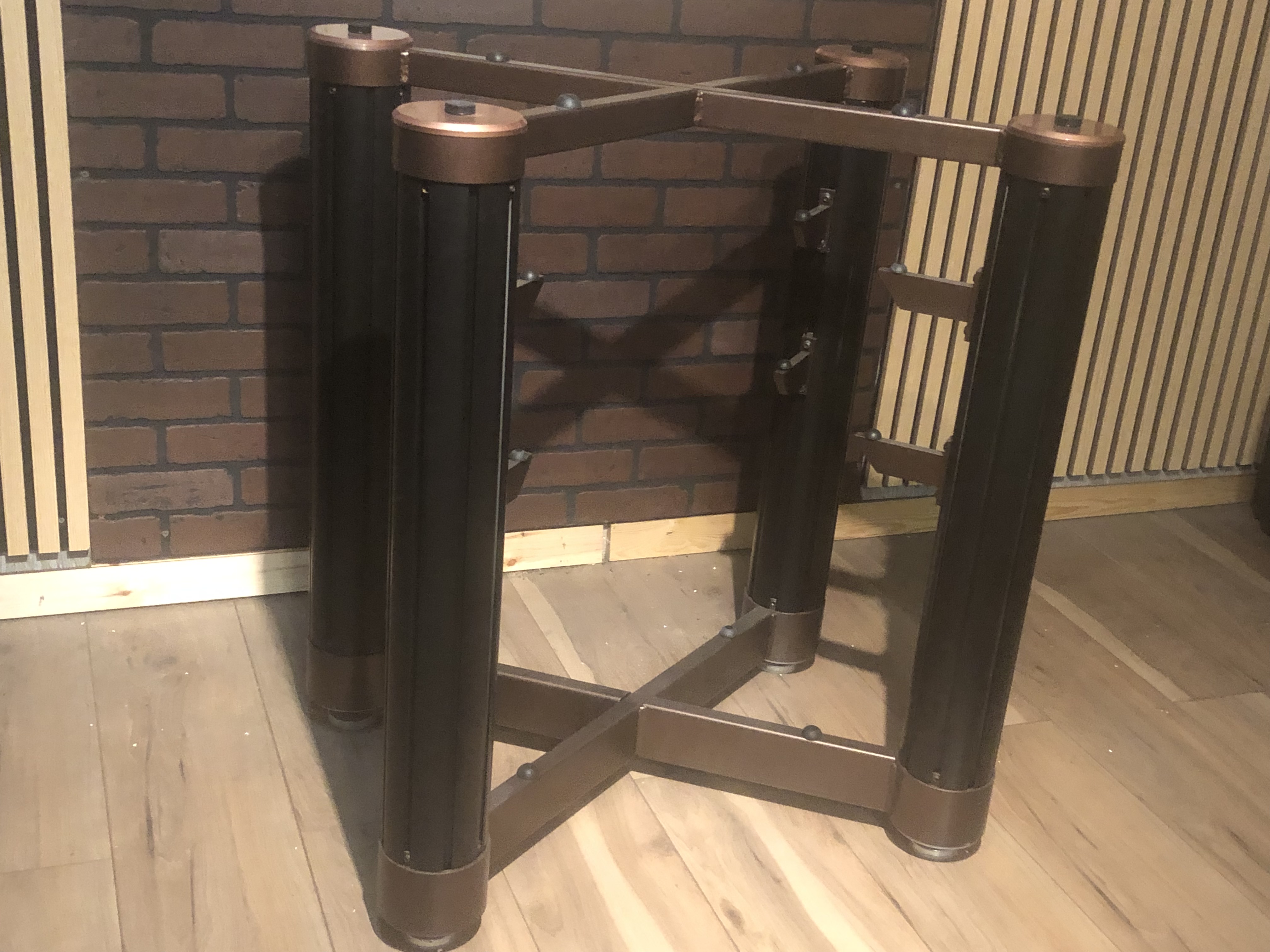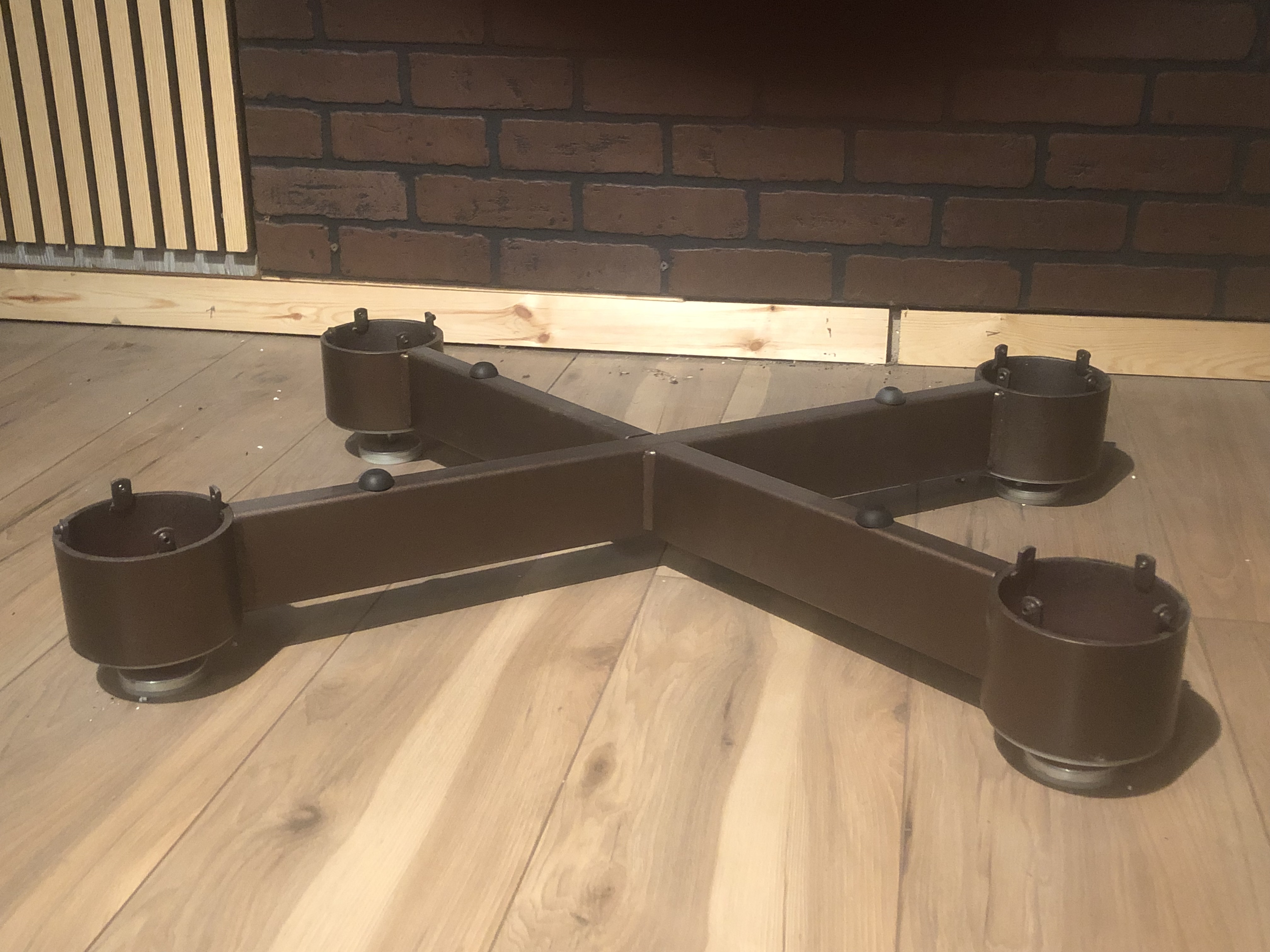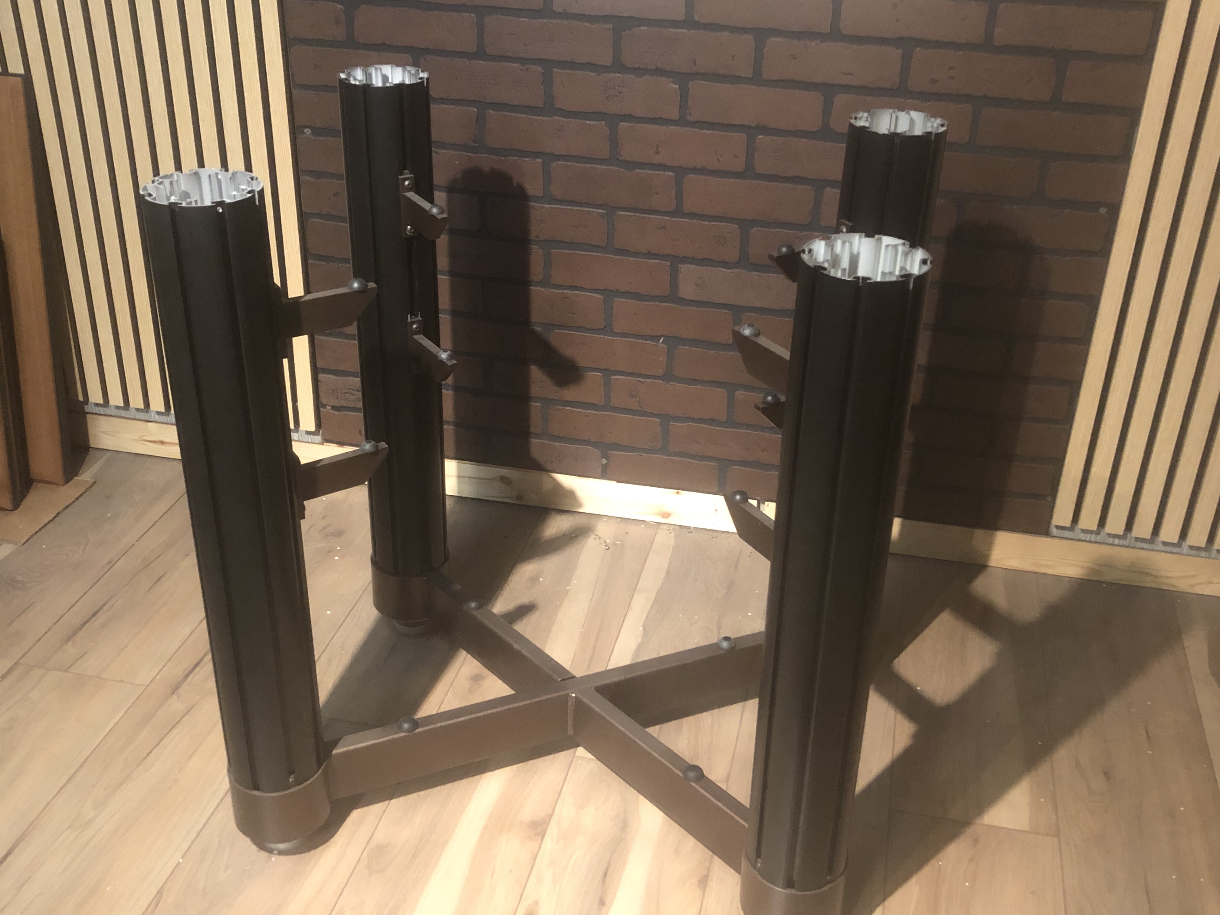 This rack is available with various top platform options. Only the super large turntable platform option uses a bushing screwed into the top of the posts. All other platform options rest on bushing screwed into the actual X-frame beams. Both variations are shown in the photo.